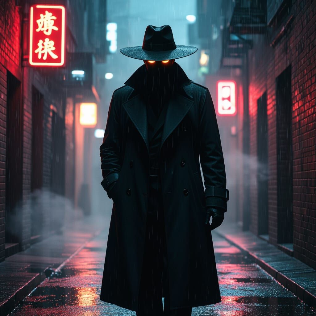 A dramatic image of a figure in shadows, wearing a trench coat and hat. The scene features rain-slicked streets, neon reflections, and rising smoke in a moody cinematic style.