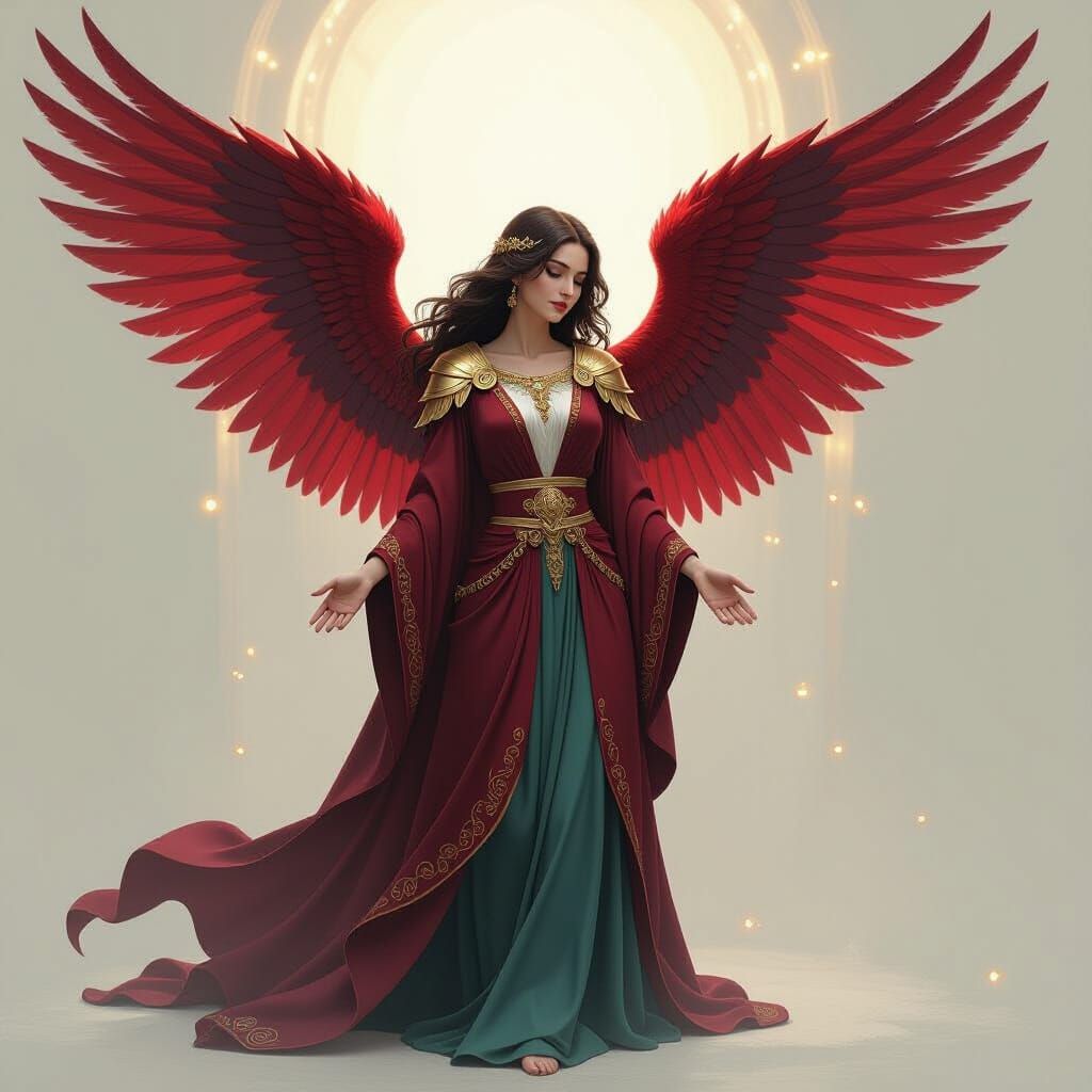 This image shows an angel in flowing robes with red wings, dreaming serenely. The artwork features soft textures and ethereal lighting, in a digital art style.