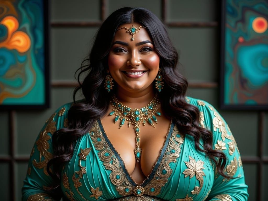 This image shows a beautiful plus-sized woman in a dramatic, high-fashion portrait, adorned in a hand-beaded and embroidered caftan with iridescent hues and intricate patterns, paired with cyberpunk-inspired jewellery and set against a sleek, gradient-lit backdrop with a subtle grid pattern, evoking a hy...