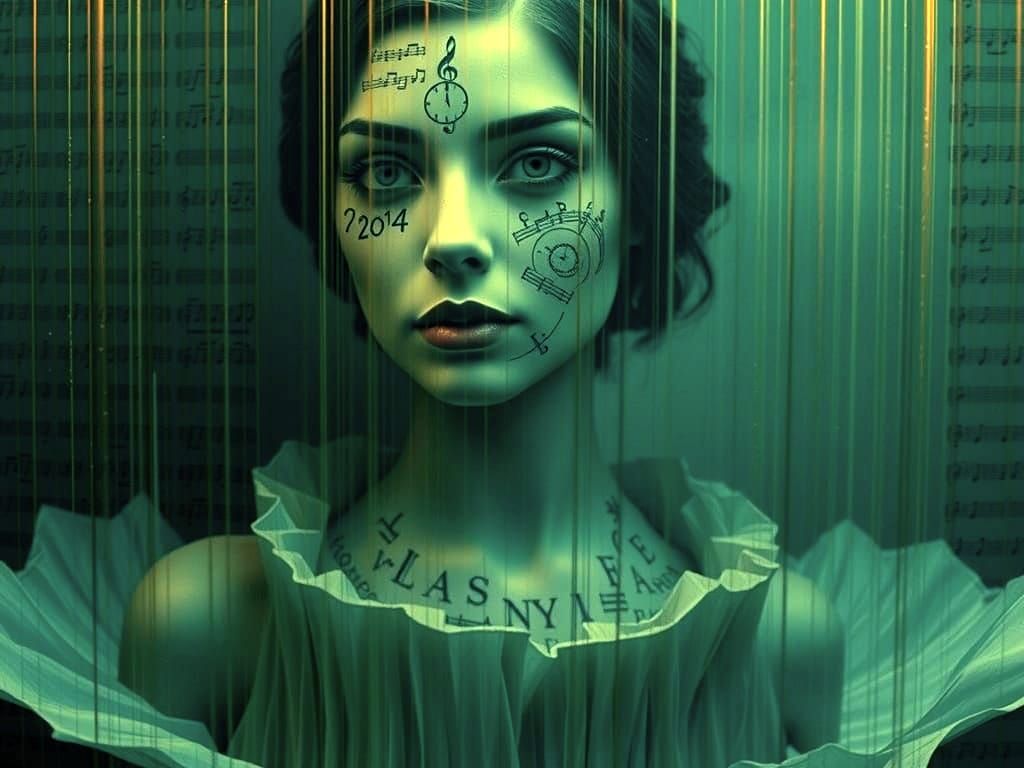 A striking picture of a woman's face adorned with musical notes in a monochrome analog film portrait. The image features newsprint text and a soft, ethereal aesthetic.