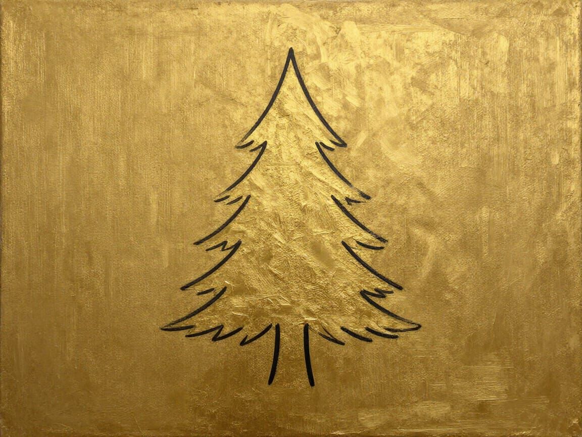 This image features a minimalist golden Christmas tree with black outlines, using only gold and yellow hues in a serene painting style.