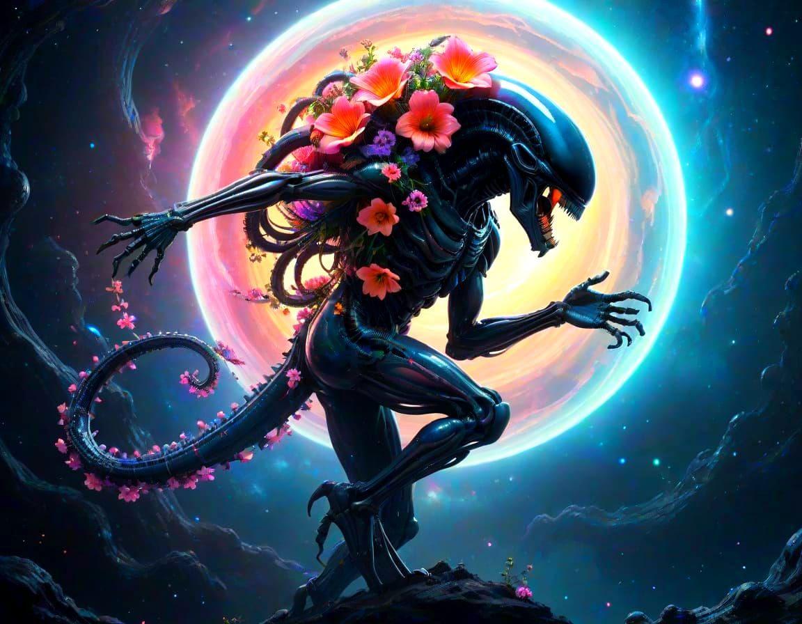 This image features a photorealistic Xenomorph decorated with cascading flowers, set against a backdrop of a glitching gas planet with radiant shadows and a holographic spectrum effect.