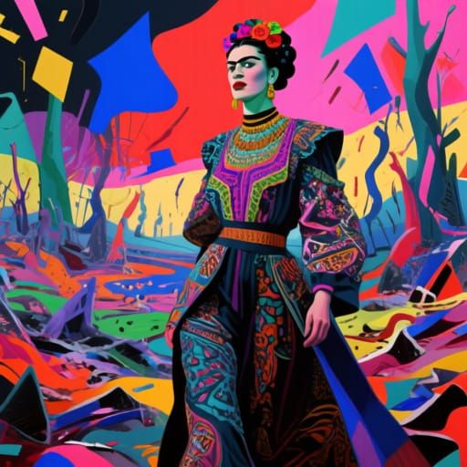 This image depicts an avant-garde fashion rebellion set against a chaotic, abstract backdrop. It features dynamic, clashing colors and intricate details suggesting societal defiance, created with a visionary, surreal aesthetic.