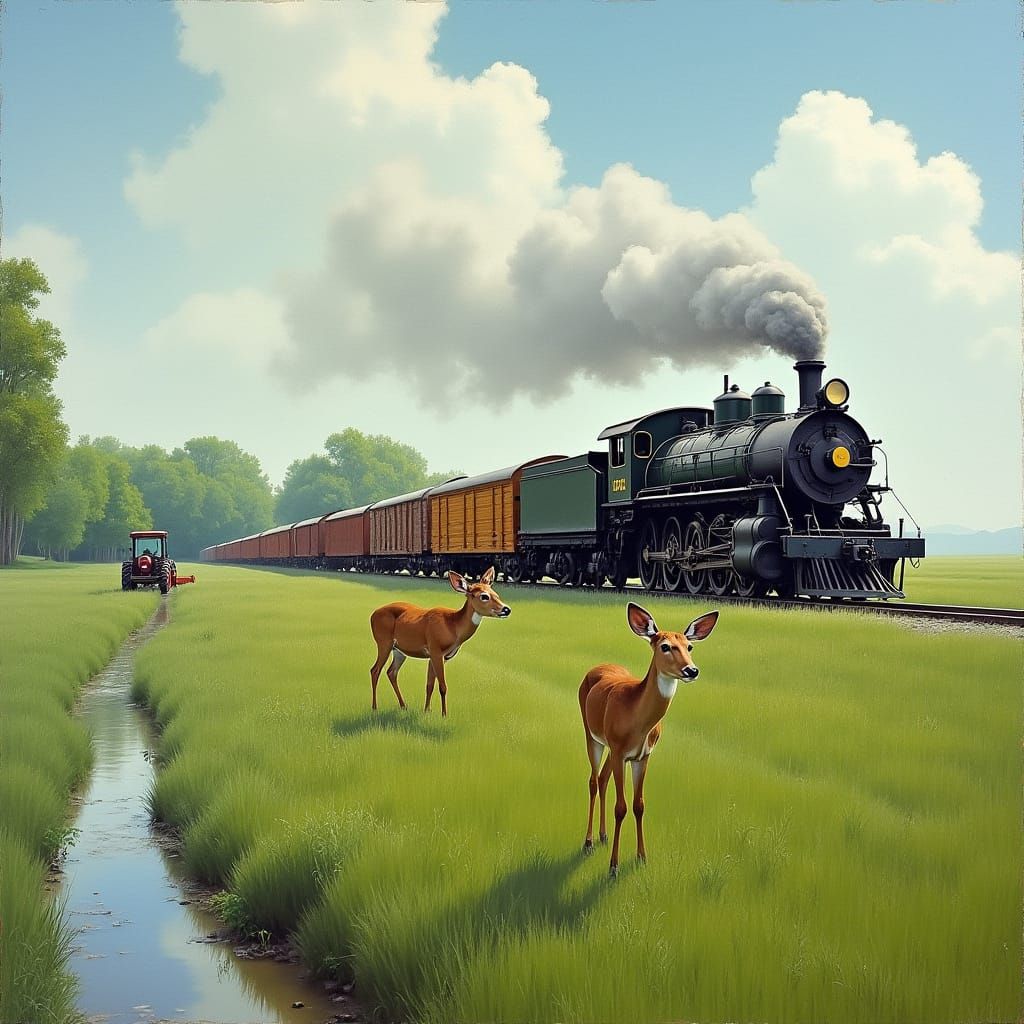 This image shows a vintage steam train pulling freight cars across a verdant plain in summer. Deer graze nearby without fear. The background features trees, a stream, and a tractor plowing a field, rendered as a vibrant oil painting.
