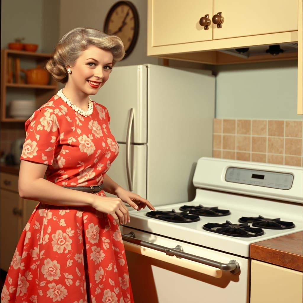 This image shows a woman in a floral dress in a vintage kitchen. The artwork evokes a mid-century illustration style, with warm colors and a nostalgic atmosphere reminiscent of American realism.