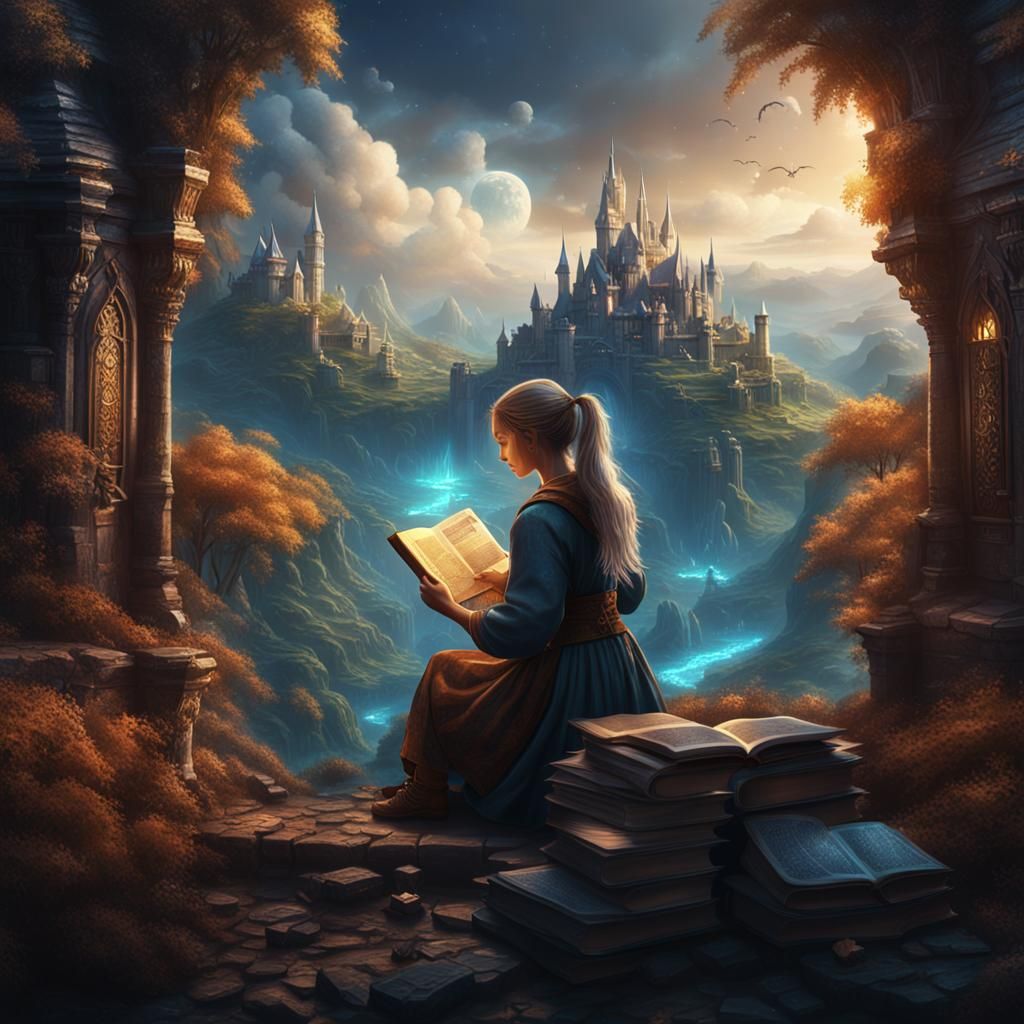 This image shows a girl engrossed in a fantasy book, with the story vividly coming to life around her. The scene is rendered with deep colors and intricate details, as fantasy concept art.