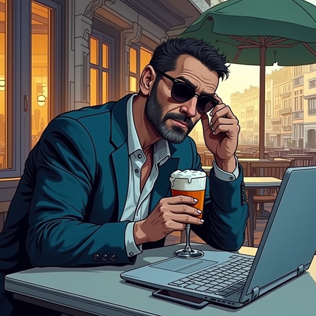 A vibrant comic book illustration of a man with sunglasses enjoying a beer at a European cafe. The artwork evokes a nostalgic 1950s aesthetic with bold lines and vivid colors.