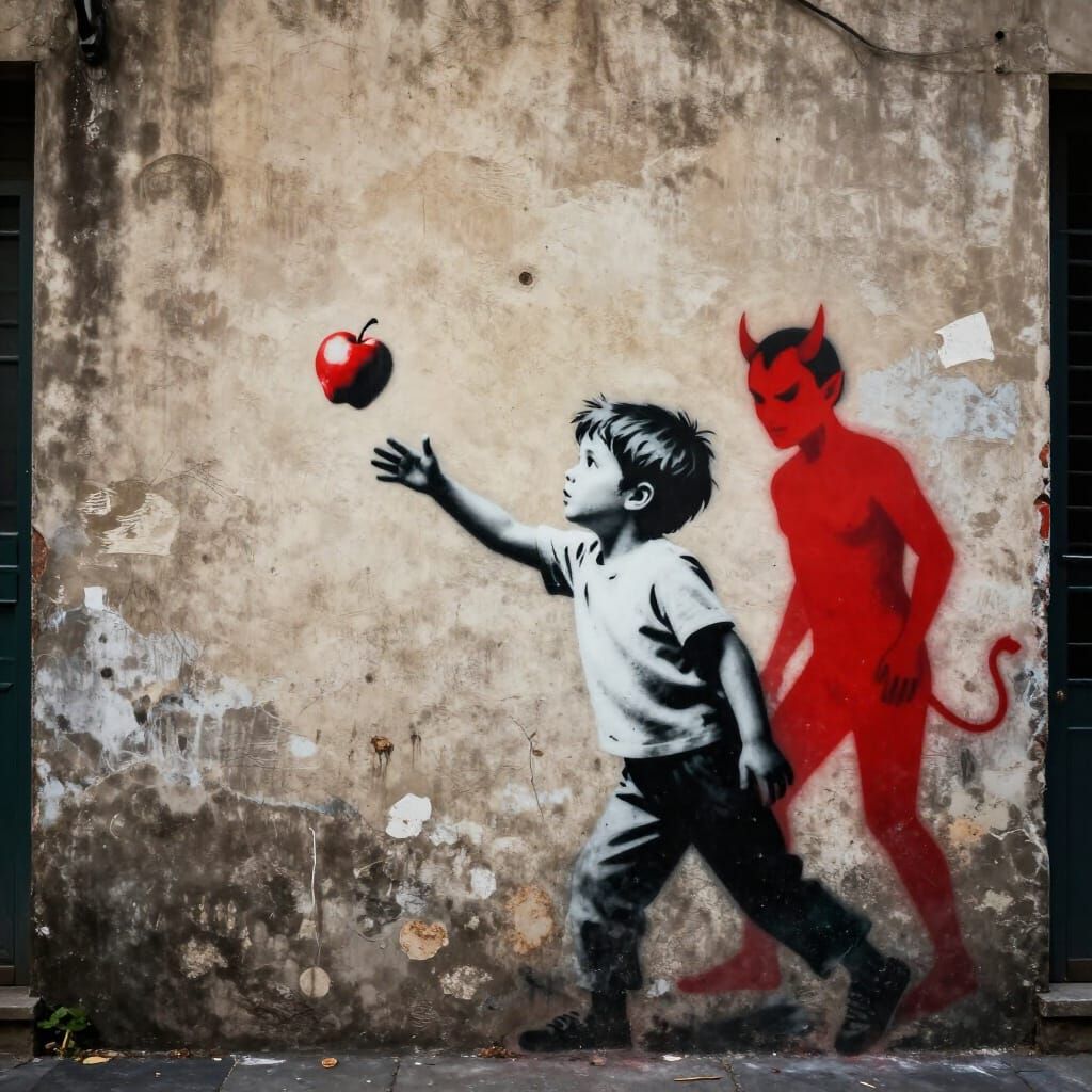 This image displays stencil street art depicting a child's desire for a falling apple, taken by a devilish figure. The artwork uses high contrast and dramatic lighting, reminiscent of Banksy's style.