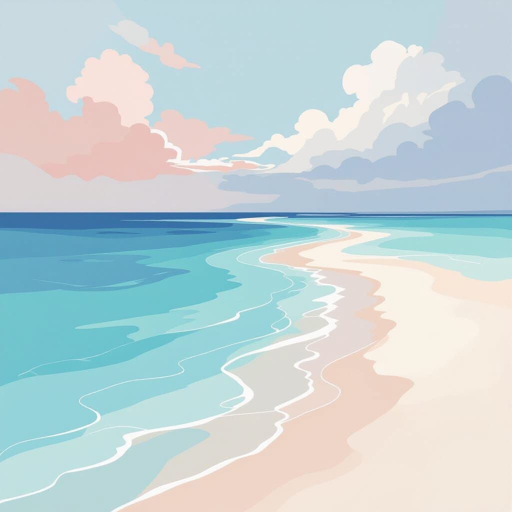 This image depicts an abstract interpretation of the Maldives, featuring swirling pastel colors like turquoise and peach to represent calm waters and beaches. It evokes relaxation and natural beauty through fluid lines and luminous gradients.