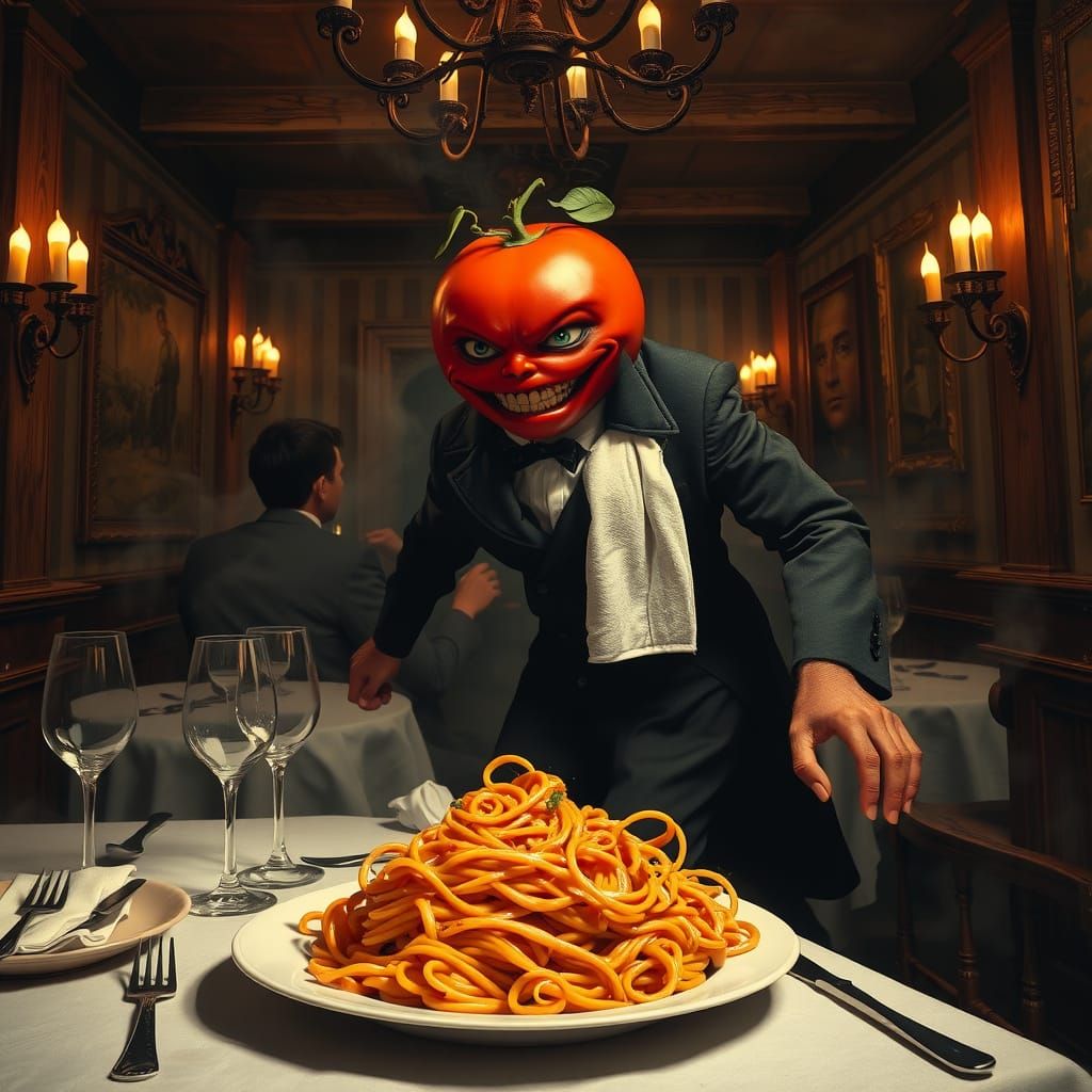 In the heart of an old French tavern from 1878, where strange paintings hang and eerie music hums, a tomato-like waiter, dressed in a black ...