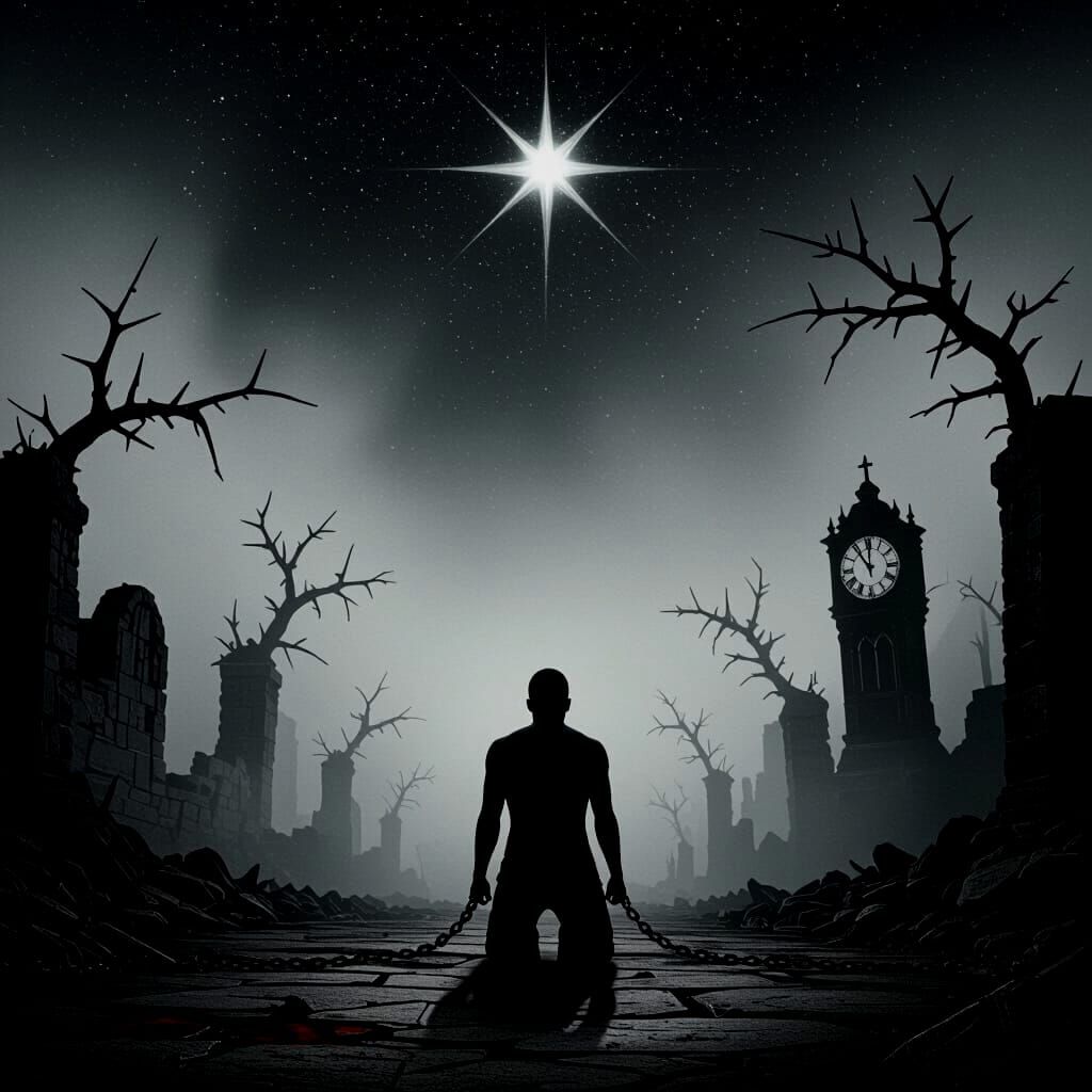 This image shows a solitary figure kneeling, bound to its shadow, set against a bleak landscape of ruins and fog. The scene is rendered in a haunting, surreal style with cinematic lighting and a gothic aesthetic.