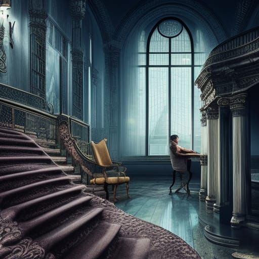 This image shows a blonde curly haired male psychiatrist. The portrait uses dramatic lighting and meticulous detail to create a cinematic and atmospheric digital painting.