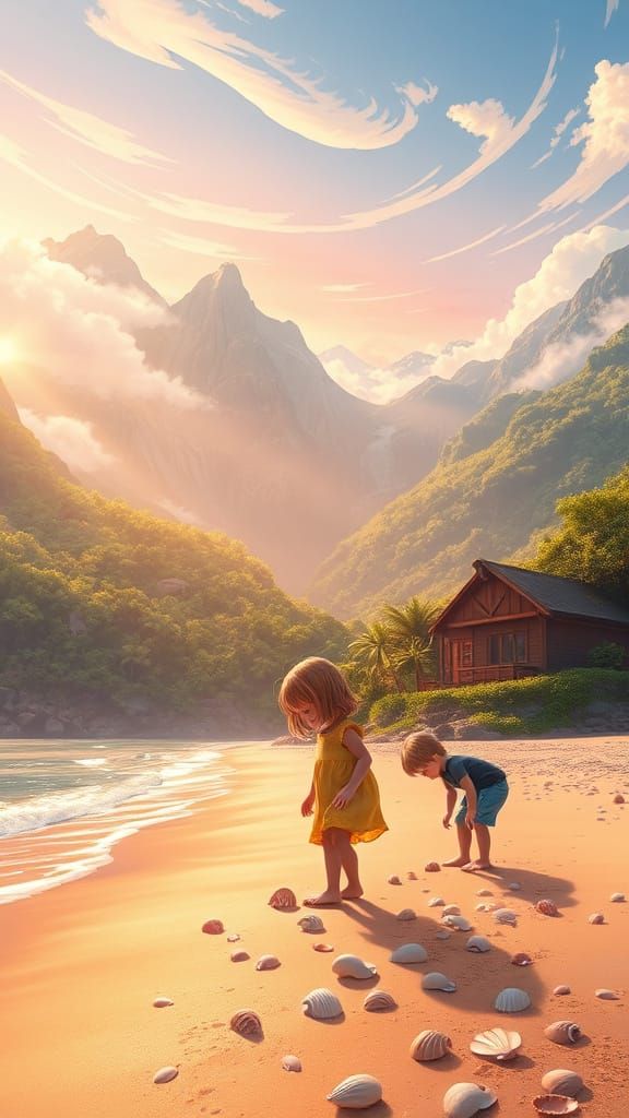 This idyllic scene depicts a seaside cottage nestled in a lush valley, surrounded by towering mountains and vibrant greenery, with a young boy and girl collecting seashells on a pristine beach, bathed in warm sunrise hues.