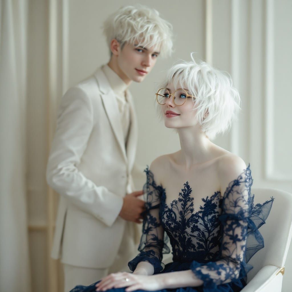This portrait features an albino teenager with messy, short hair and bright blue eyes, wearing a stunning, intricately detailed navy lace dress. She sits on a white chair, clasping her hands together, with a soft smile. Her sibling stands behind her, mirroring her expression, both lost in their reflectio...