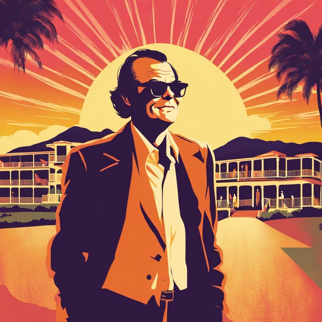 This image reimagines the Shining movie poster with Jack Nicholson in a vintage illustrated style, set against a giant sun over a romantic hotel, evoking a romantic comedy feel.