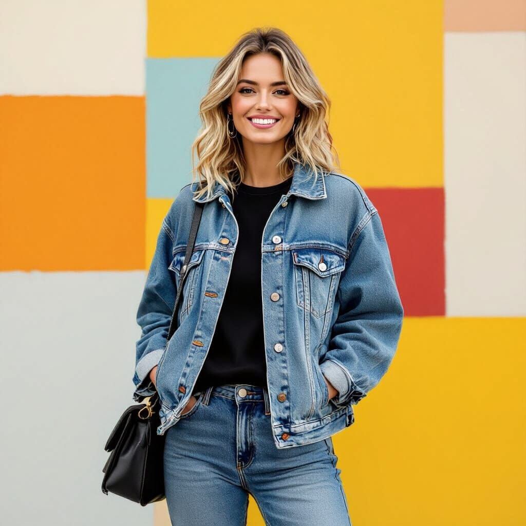 This image showcases a realistic portrait of a blonde woman in a denim jacket, smiling brightly. The urban setting and photographic detail capture precise textures, inspired by renowned photorealist artists.