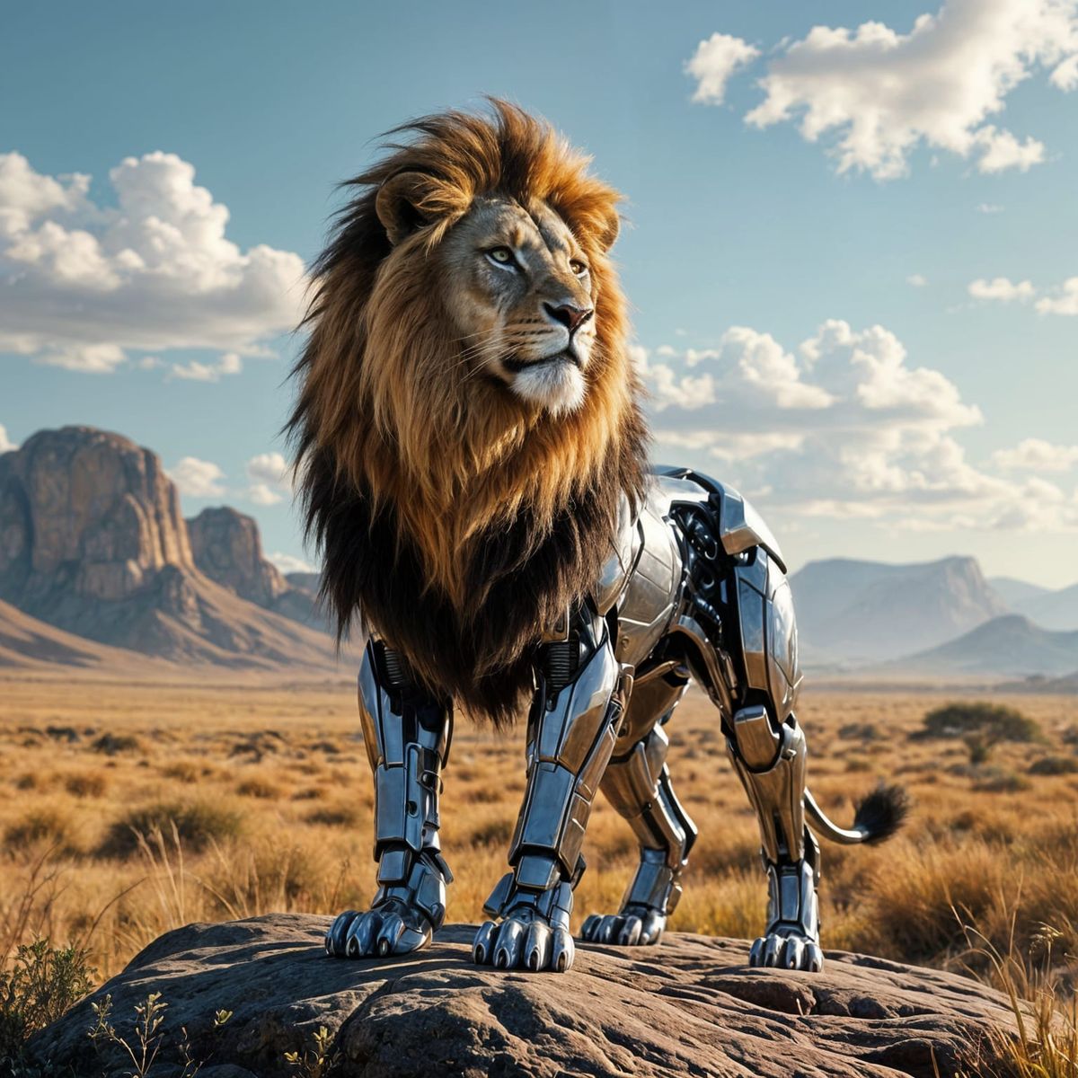 This image shows a cyborg lion standing on a rocky outcrop. The metallic fur shines in the sunlight, in a photorealistic style reminiscent of National Geographic. The scene has cinematic lighting.