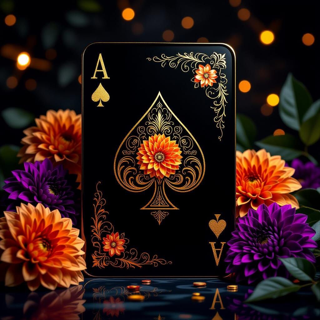 This image features a shiny black Ace of Spades adorned with gold curls and detailed floral patterns. It is surrounded by vibrant orange and purple flowers in a dimly lit, atmospheric casino setting.