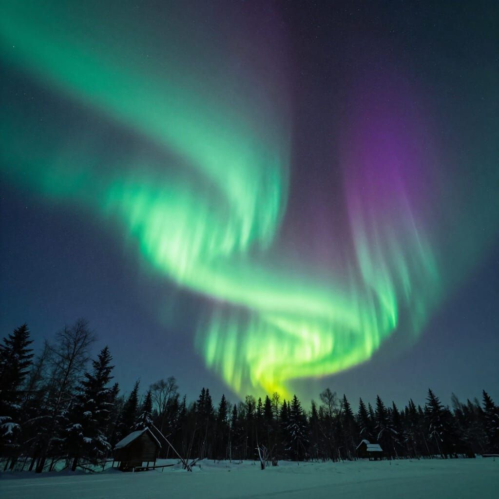 This image captures the breathtaking beauty of the aurora borealis, displaying vibrant, multi-colored lights dancing across the dark night sky in a stunning celestial display.