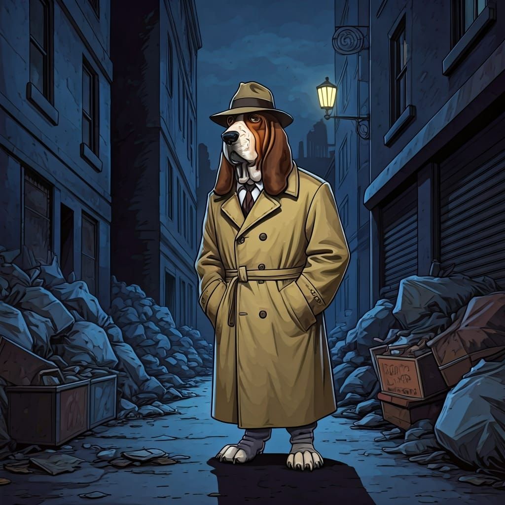 This image shows an anthropomorphic basset hound detective investigating a dark, trash-filled alley. The illustration is rendered in a classic noir style.