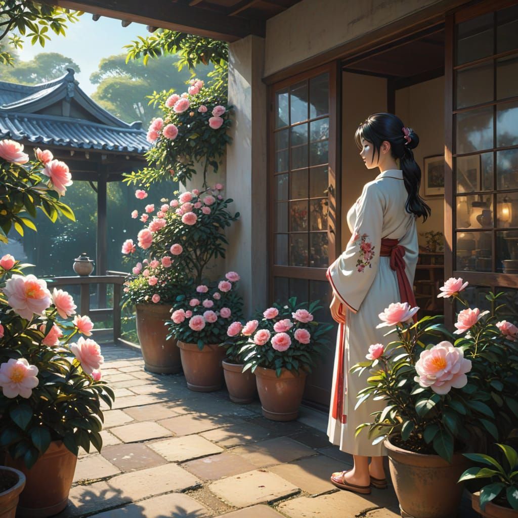 A vibrant anime image shows camellia flowers decorating a garden and veranda. The composition features women and vase paintings with delicate petals and soft lighting in a Makoto Shinkai style.