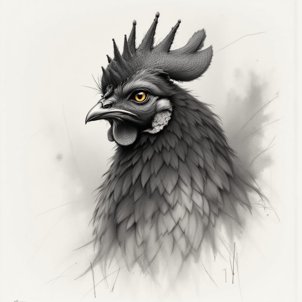This image shows a charcoal sketch of a rooster. The artwork evokes the style of Prudhon and Degas, with delicate lines and shading that capture the rooster's form and texture.