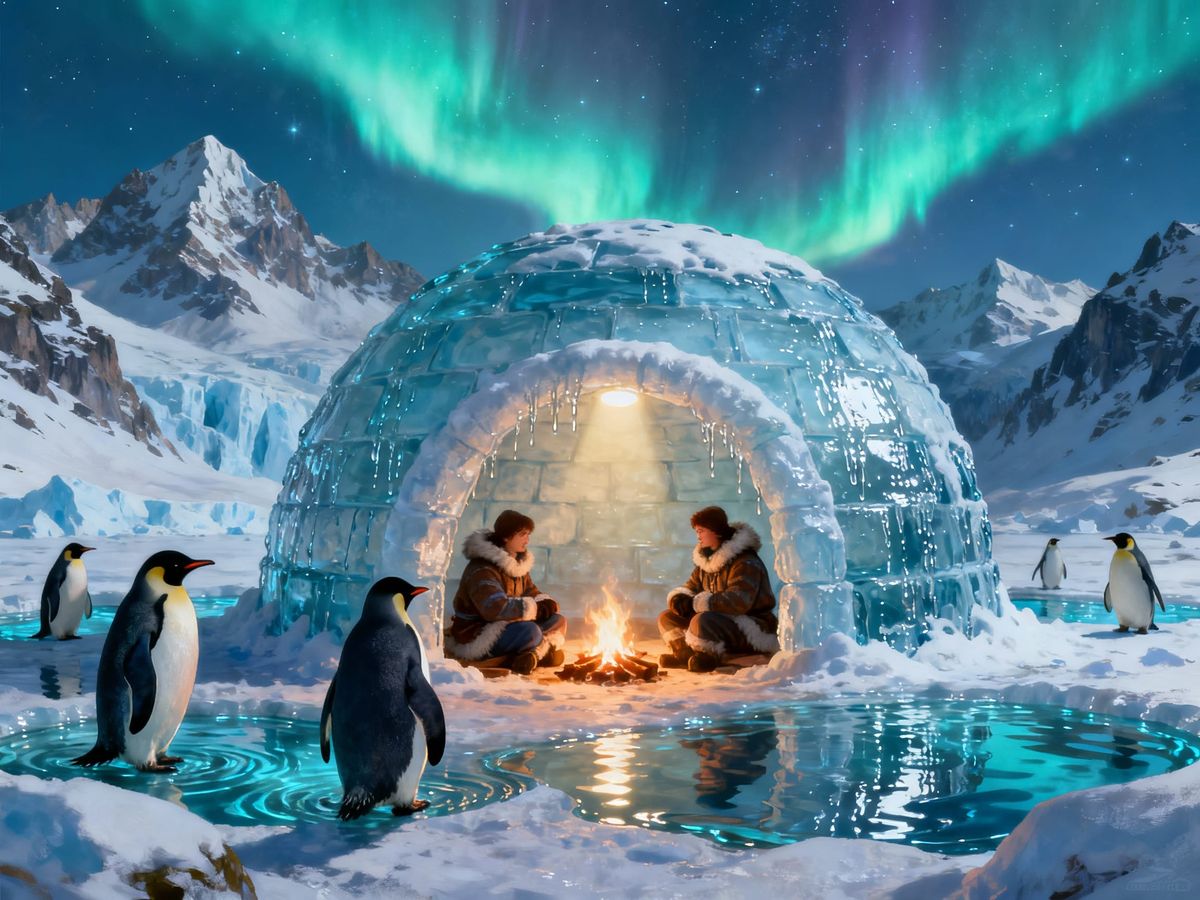 This image shows a fantasy landscape of Swiss Alps with a unique water igloo. Inside, Eskimos and water penguins gather around a fire under an aurora.