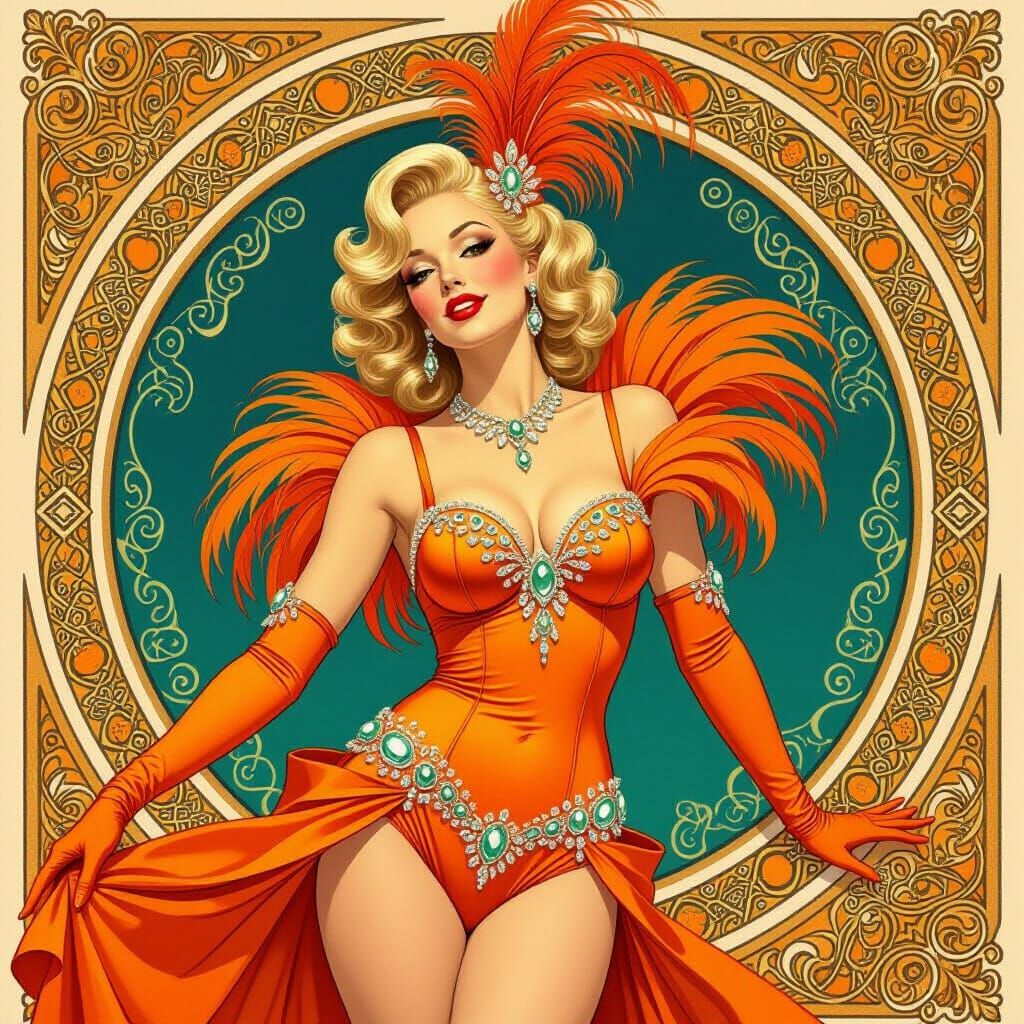 This image shows a blonde Las Vegas showgirl in an opulent orange costume. The artwork blends Art Nouveau patterns with elegant lines and vibrant colors, presented as 3D rendered digital art.