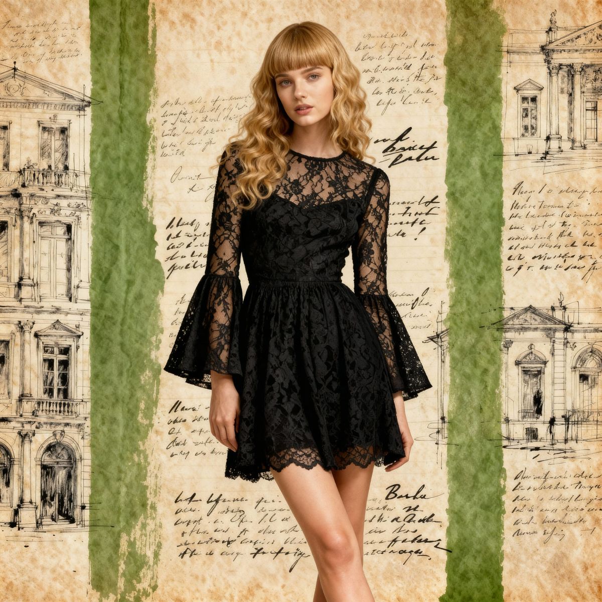 This image depicts a woman in a vintage-inspired black lace minidress with bell sleeves, set against an artistic background resembling a sketchbook with architectural drawings. The style is modern fashion with a vintage elegance.