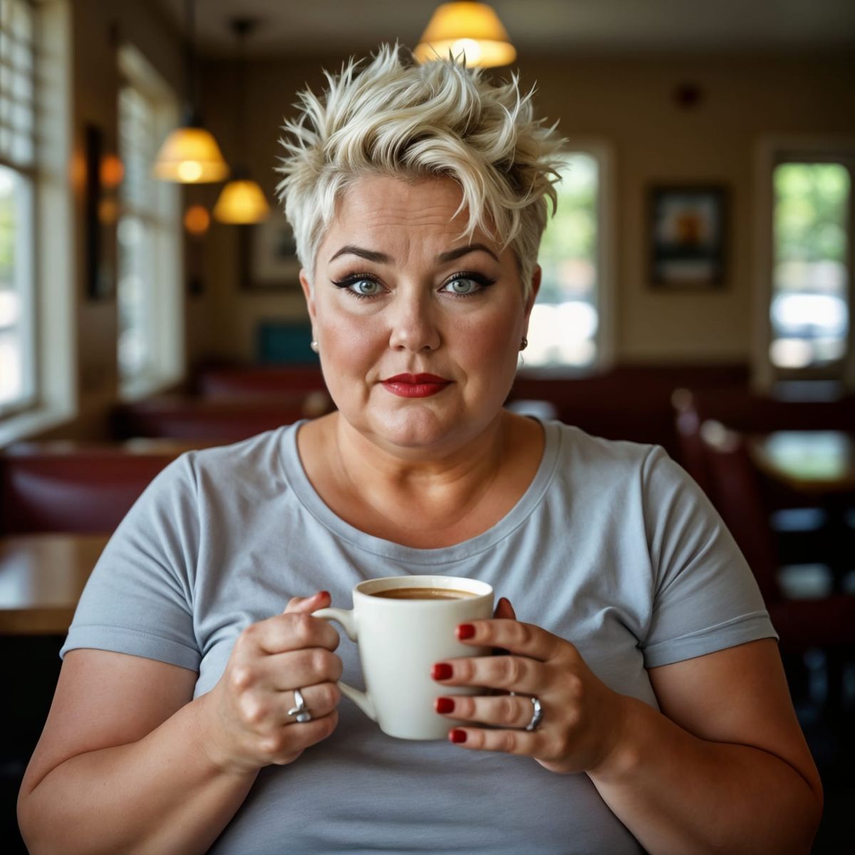 Cinematic portrait of an older plus-sized woman with choppy blonde hair holding a steaming coffee mug. The image evokes classic painting styles.