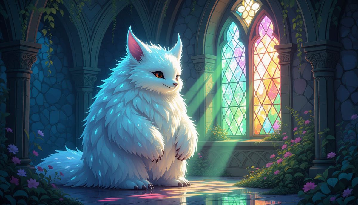 This image shows a gentle, furry mythical creature in a dreamlike setting. Ethereal light filters through stained glass, creating colorful patterns in vibrant, detailed matte painting style.