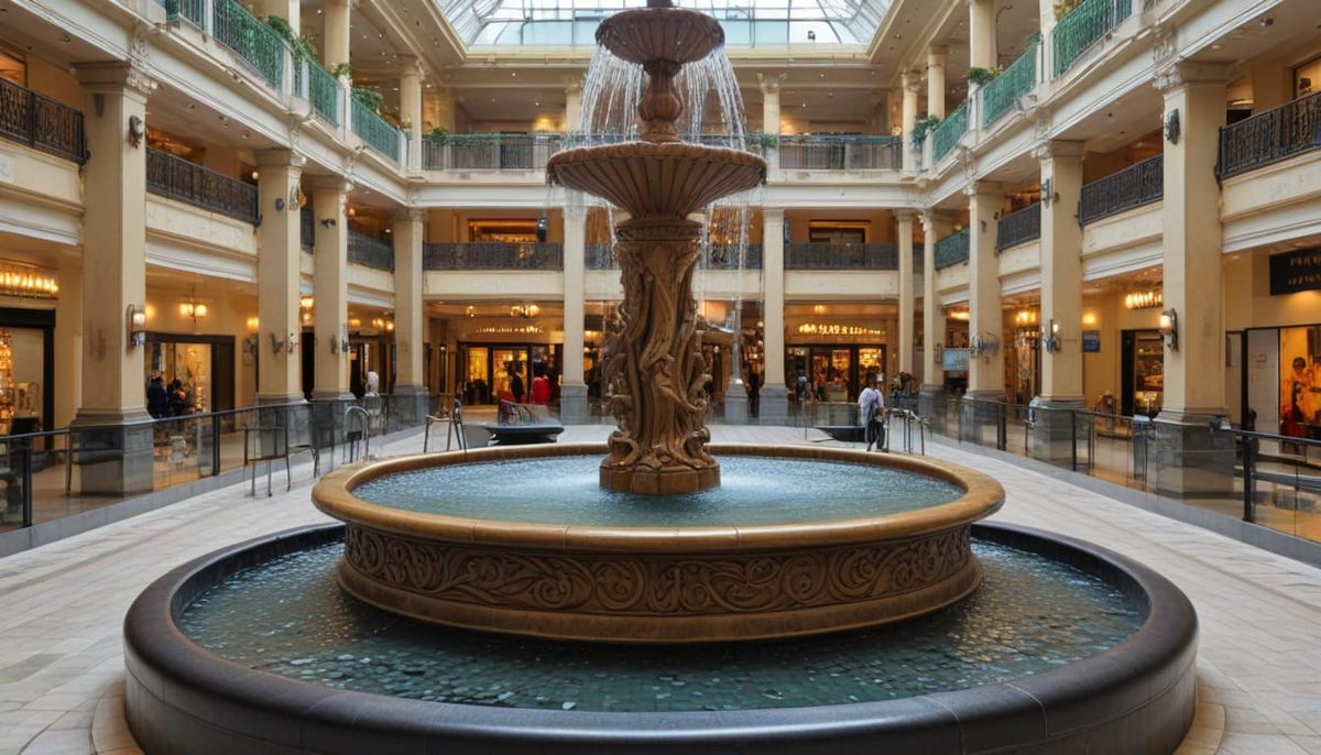 This image shows an art nouveau fountain inside a shopping mall. The fountain is intricately designed, reflecting the art nouveau aesthetic.