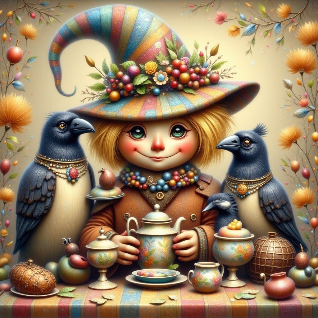 This image shows a whimsical scarecrow with button eyes and patchwork coat hosting a tea party. Crows and woodland creatures are among the guests in this charming scene.