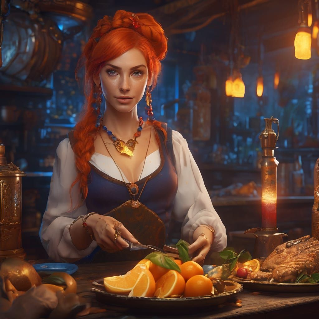 A digital painting of a cunning changeling disguised as a barmaid serving food. She has red hair and wears a golden amulet, illuminated by soft, warm lighting in blues and oranges.