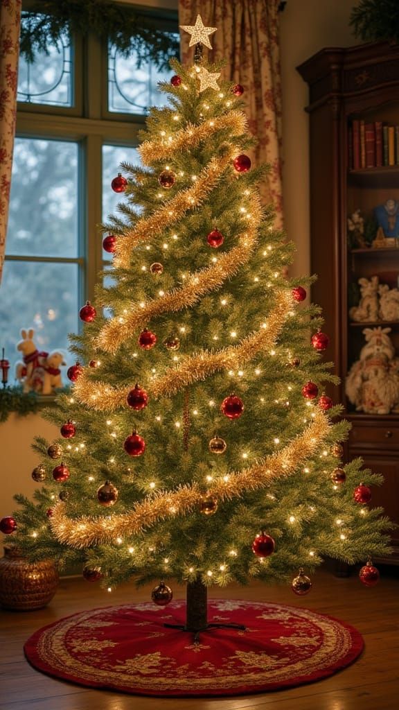 This image showcases a beautifully decorated vintage Christmas tree with antique ornaments and sparkling tinsel, featuring warm lighting and a nostalgic, whimsical feel.
