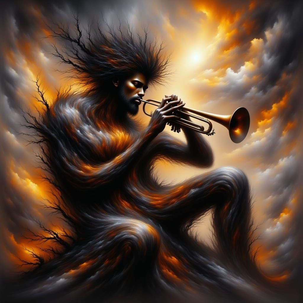 This image depicts a joyful black musician playing a trumpet with puffy cheeks, set against a colorful and lively background that captures the essence of the spirit of nature.