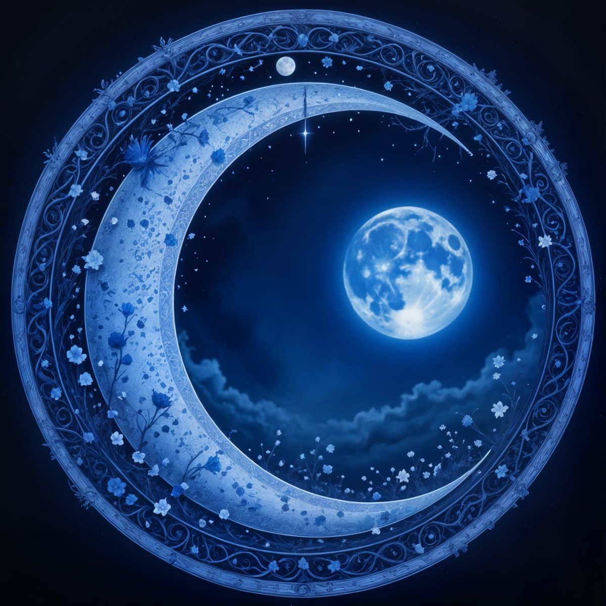 This image depicts two glowing blue crescent moons in an indigo sky, with shimmering silver lace and cosmic flowers. A dreamlike Art Nouveau scene.