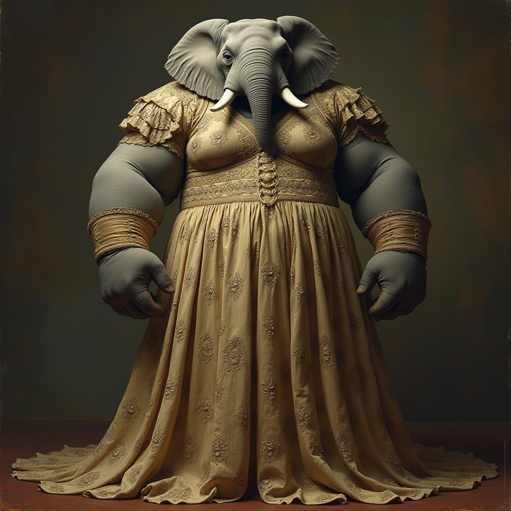 A powerful female loxodon stands proudly, wearing a lavish, intricately embroidered gown that contrasts with her sturdy, muscular build, evoking Renaissance-era portraiture and bold brushstrokes.