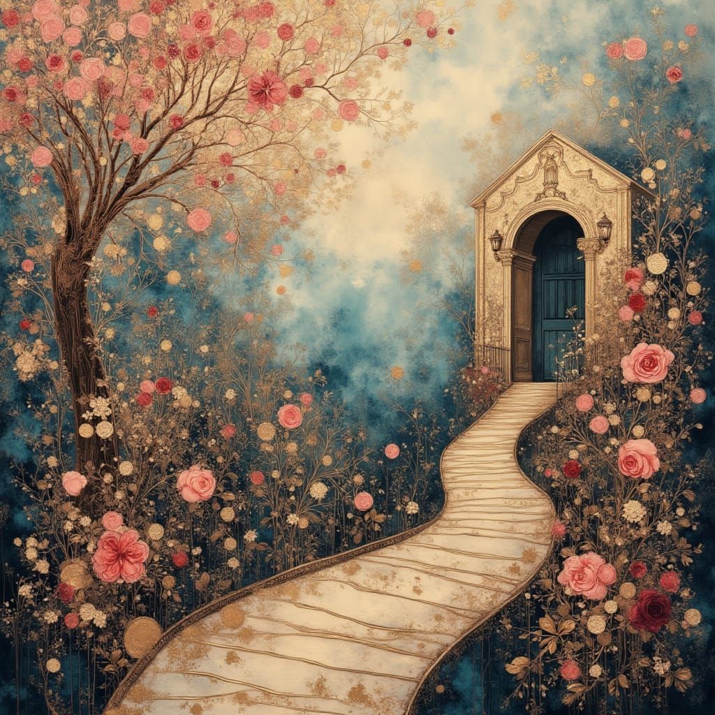 This image shows a textured impasto oil painting of an English garden. Warm stone and roses are depicted with ethereal dreamscapes and soft bokeh for a natural ambiance.