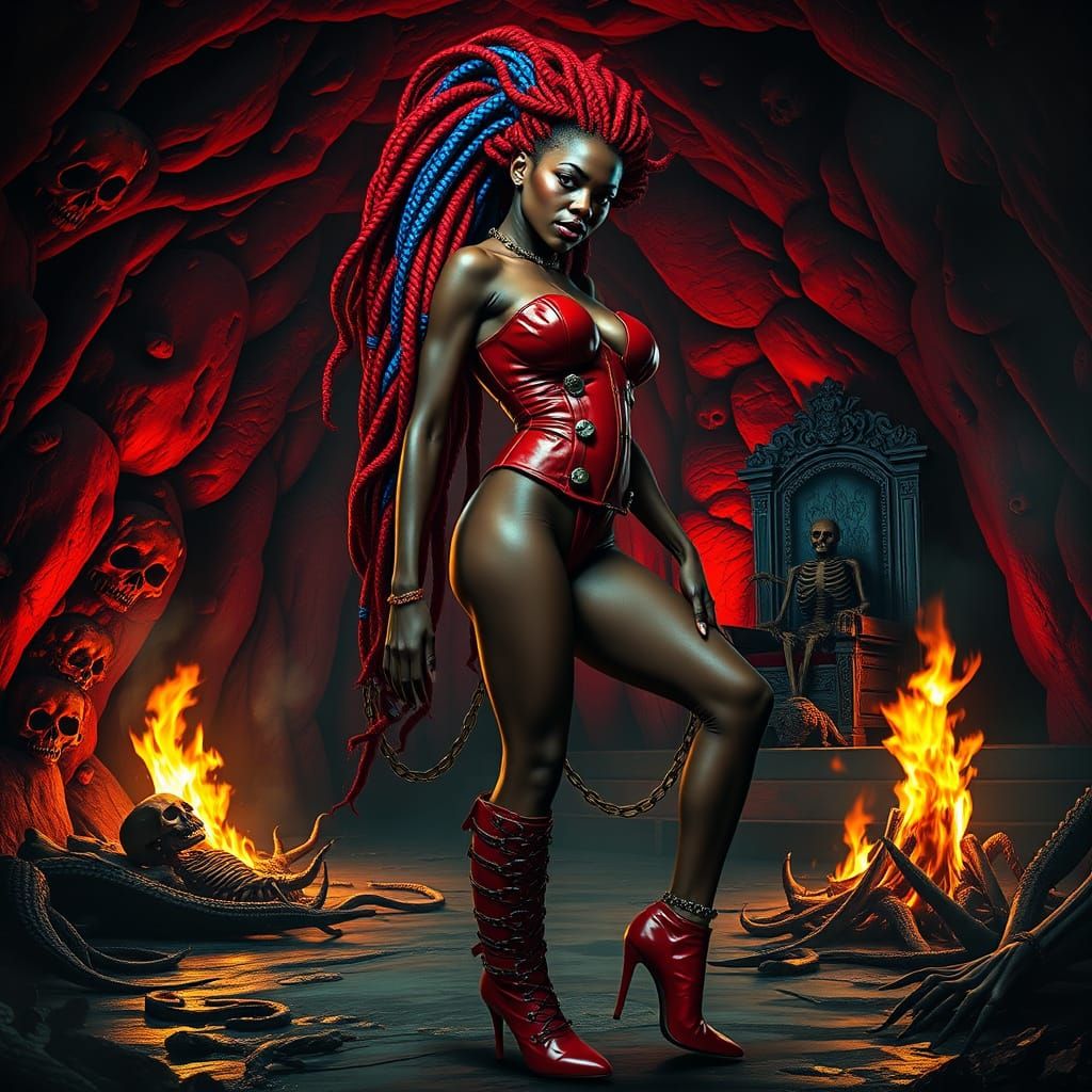 This image depicts a dark-skinned woman posing as a terrifying clown, with vibrant red and blue braided hair and a skintight latex corset adorned with metallic buckles. She's wrapped in heavy chains and surrounded by a dark, damp cave with a burning bonfire, twisted decorations, and a skeletal figure in ...