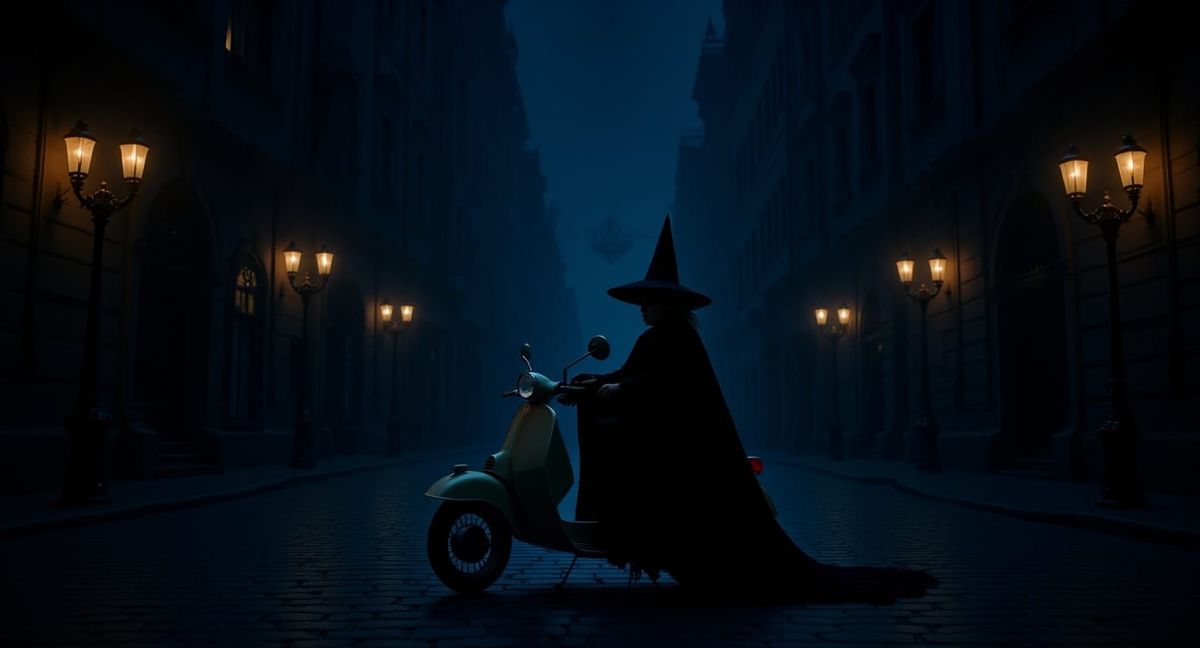 This image shows a solitary witch on a vintage scooter on a deserted cobblestone street at midnight, illuminated by gas lamps. Moody blues and deep reds create an eerie, dark fantasy atmosphere.