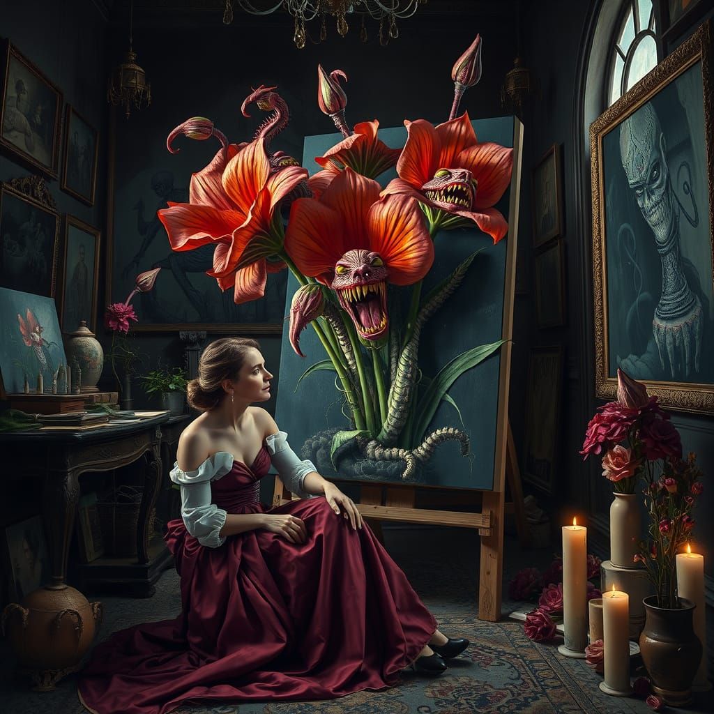 A striking picture of an artist in elegant clothing surrounded by cosmic horror artwork. The scene features twisted, vibrant flowers with menacing eyes, rendered as a hyper-realistic matte painting.