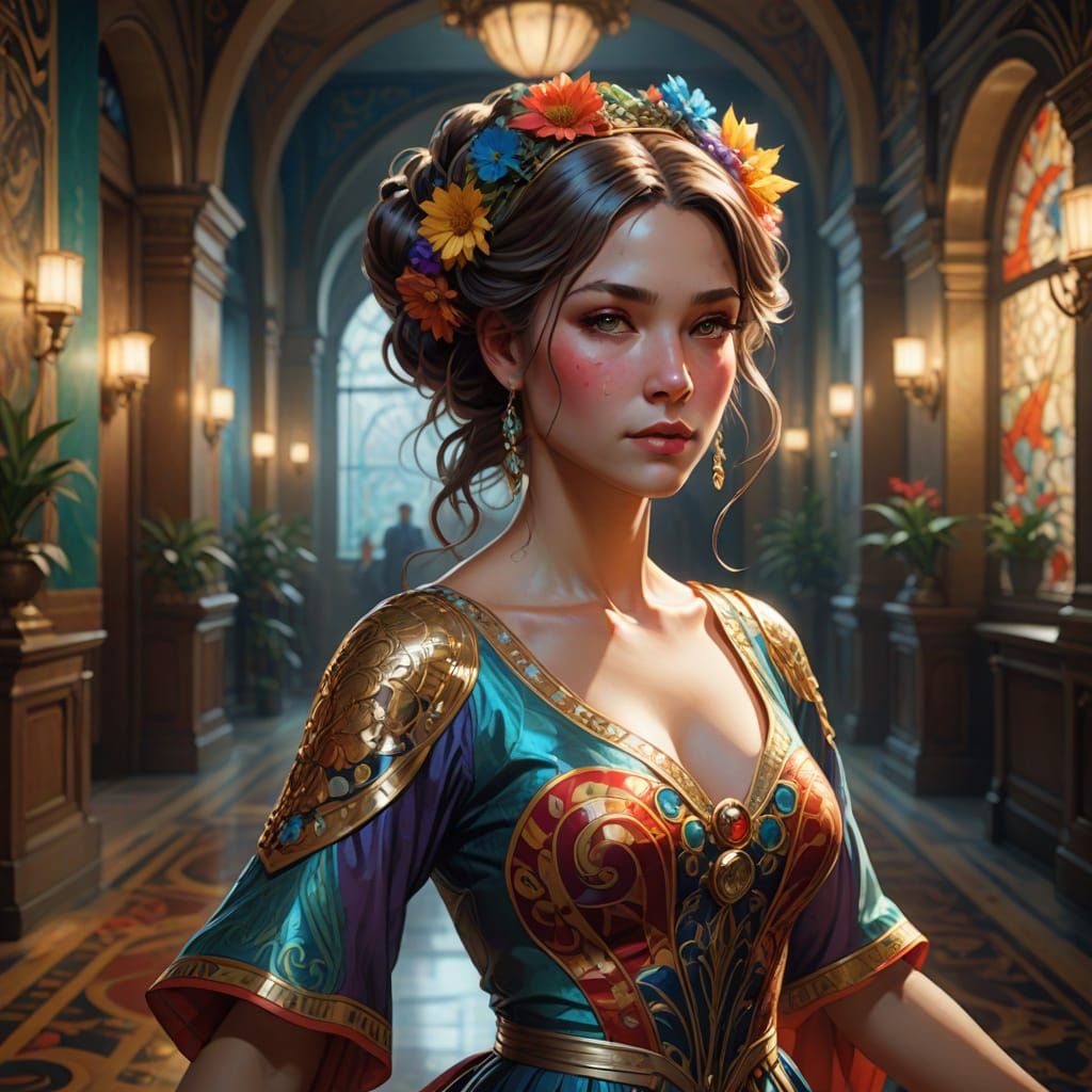 Concept art portrait of Enid Sinclair dancing dynamically in a colorful dress, lit by volumetric light in a hallway. Features hyperdetailed textures and triadic colors.