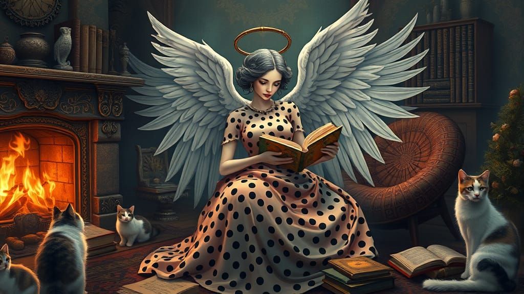 This image shows a serene Angel of Death in a dreamlike scene, surrounded by fluffy cats and ancient tomes, with a Yayoi Kusama-inspired dot pattern dress, in a vibrant and surreal atmosphere, reminiscent of Russian landscape art.