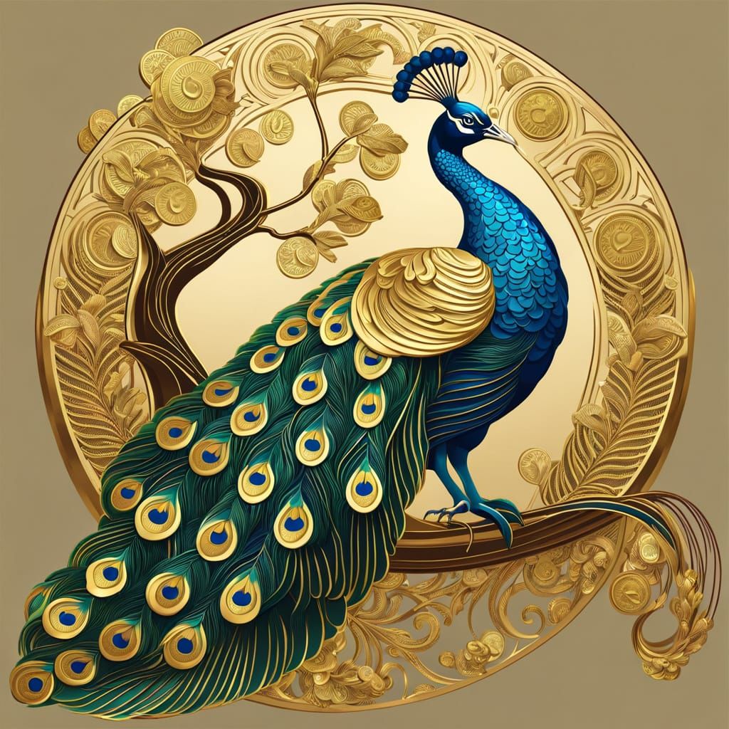 This image showcases an opulent peacock crafted from gold coins and folded banknotes, detailed with intricate currency patterns. Presented in a vintage illustration style with flowing lines and rich metallic colors.