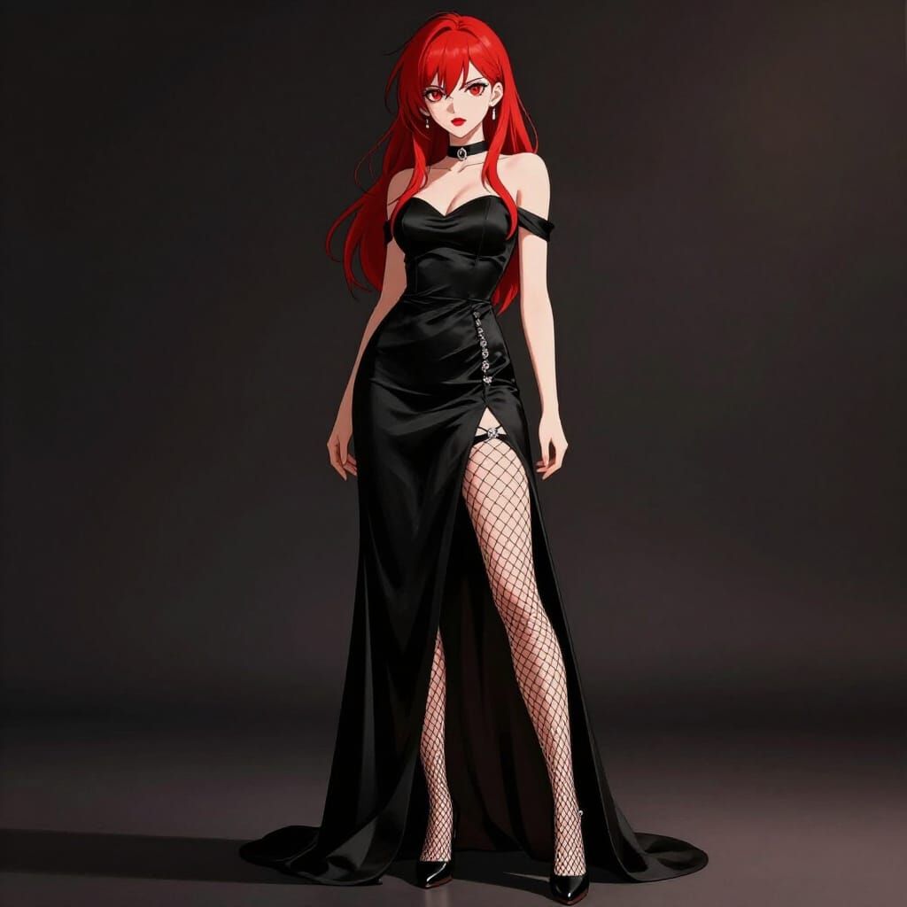 This image showcases a striking anime woman with red hair, red eyes, and red lipstick, dressed in a black party gown and fishnets. Dramatic lighting enhances the detailed, vivid anime style.
