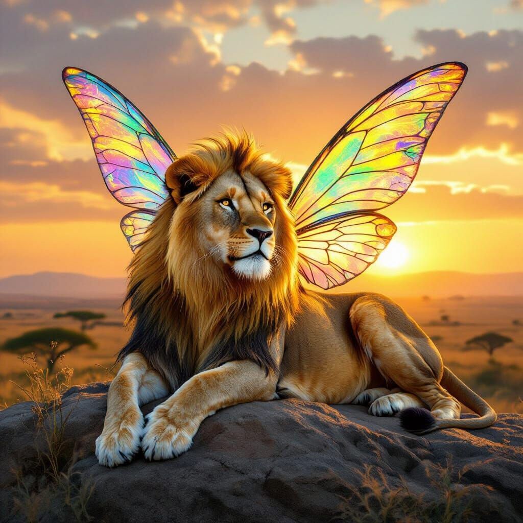 A striking picture of a lioness with iridescent fairy wings. The regal creature rests on a rocky outcrop, overlooking an African savanna bathed in warm golden light, rendered with realistic textures and ethereal fantasy elements.