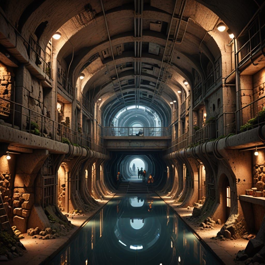 This AI-generated image depicts a vast and intricate underground city, showcasing complex architecture and a subterranean environment.