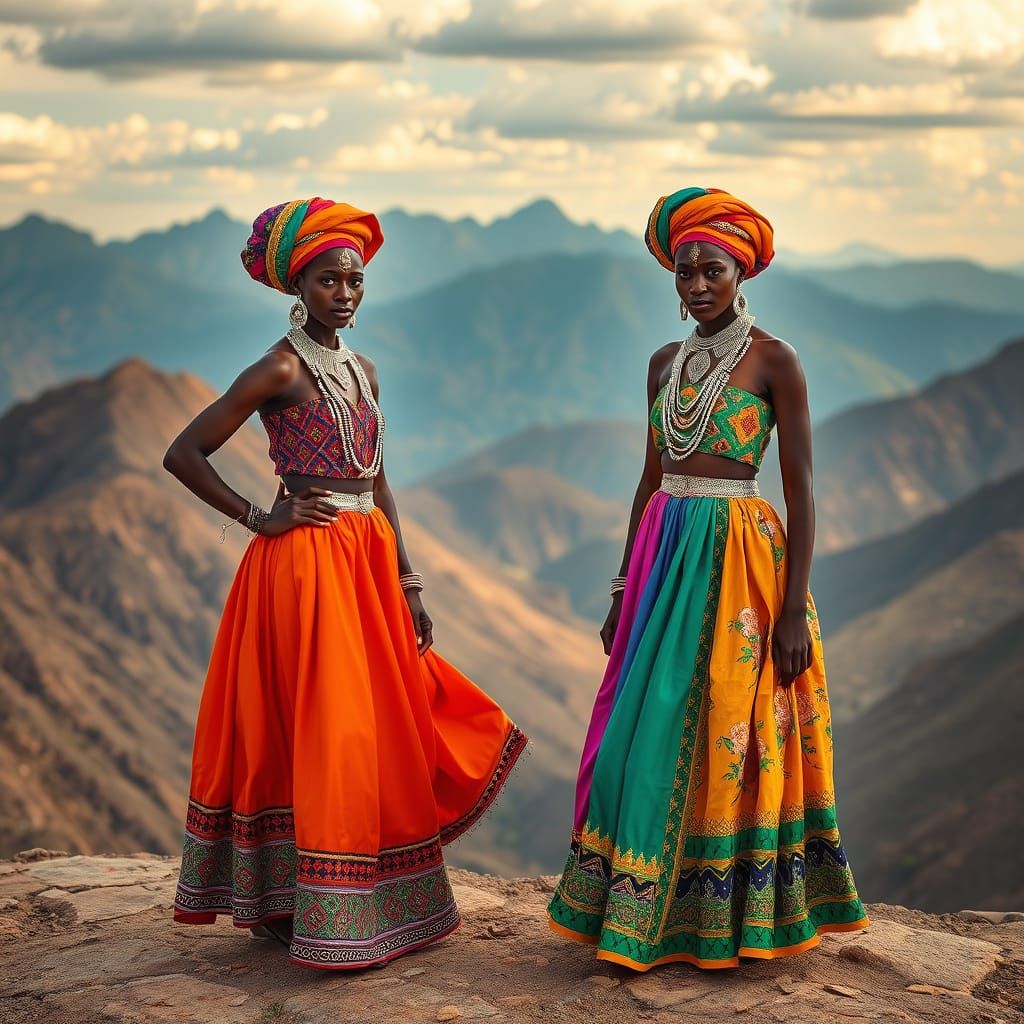 This image showcases Eritrean women proudly wearing traditional summer attire, adorned with stunning headpieces and silverware jewelry, set against a dramatic mountainous backdrop, blending heritage and modern style.