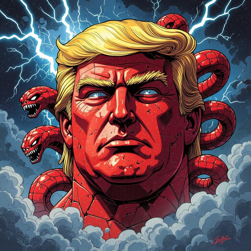This image features a giant Trump head sculpted from red granite, resembling a multi-headed Hydra, emerging from stormy clouds in a Marvel Comics style splash page.